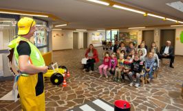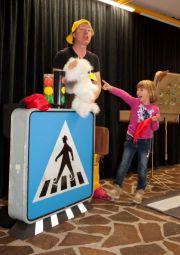 Dass Verkehrssicherheitsarbeit durchaus unterhaltsam sein kann, zeigte in Untereisesheim zudem Clown Tilo. Mit dem ABC-Schützen Alex überquerte er einen Zebrastreifen, mit den Erstklässlerinnen Lisa und Leonie zauberte er die Farben einer Ampel herbei. Zu guter Letzt ließ der Entertainer auch noch die erste Sicherheitsweste erscheinen. Den Rest brachte Postmitarbeiterin Melanie Plietzsch mit einem Handwagen höchstpersönlich vorbei.
