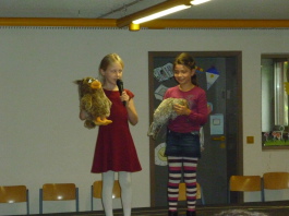 Frau Peters begrüßte die Erstklässler und ihre Familien und erzählte, dass es in der Schule viele Hände geben wird, die den Erstklässlern helfen können, vor allem auch die ihrer Paten aus der vierten Klasse. Das Kollegium wurde vorgestellt und dann begann auch schon die Aufführung der Zweitklässler.