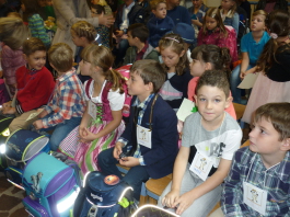 Sie erzählten den Erstklässlern mit Buchstaben und Zahlen- Raps und Liedern, was man in der Schule lernt.