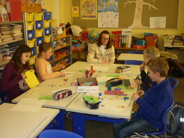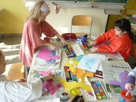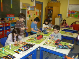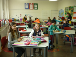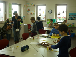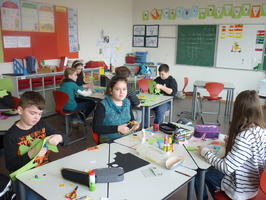 Schon in der Woche davor konnten sich die Schülerinnen und Schüler eine Gruppe aussuchen, bei der sie gern mitarbeiten wollten. Am Basteltag entstanden dann unter der Anleitung von Eltern und Lehrerinnen viele hübsche Bastelarbeiten. Am Ende des Tages schmückten Raupen und Frösche, Hühner und Lämmchen, Mädchen und Blumen, Bienen und Hasen, Küken und Schmetterlinge die Fenster und Gänge der Grundschule.