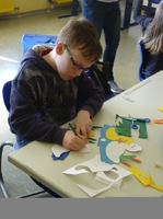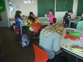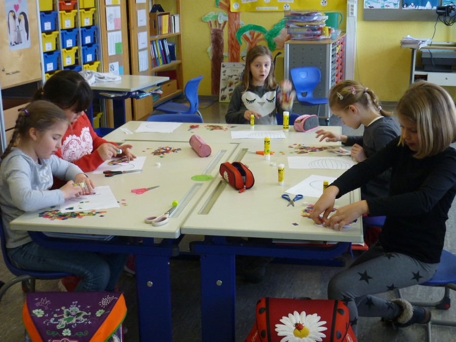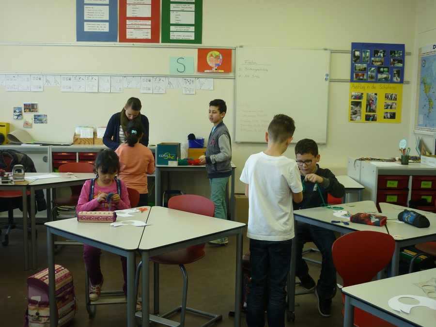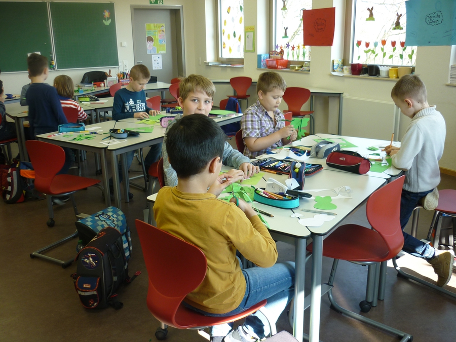 Am vergangenen Donnerstag wurde der letzte Rest des Winters aus unserem Schulhaus verbannt. Es war wieder Basteltag! Alle Kinder haben fleißig ausgeschnitten, schabloniert und geklebt, damit wir den Frühling auch in unserer Schule willkommen heißen können. Und das hat gleich Wirkung gezeigt! Während die Kinder ab 10.30 Uhr in selbstgewählten, jahrgangsgemischten Gruppen lustige Osterhäschen, freche Frösche, filigrane Schmetterlinge, bunte Blumen, Zick-Zack-Ostereier, Phantasievögel, Entenfamilien und Pomponvögelchen gebastelt haben, strahlte die Sonne das erste Mal seit Tagen von einem blauen Himmel. Fenster, Türen und unsere Aula begrüßen so geschmückt jetzt alle mit frühlingshaften Motiven, sorgen jeden Tag für gute Laune und bilden auch einen schönen Rahmen für unser Frühlingskonzert, das am 19.04.2016 bei uns in der Schule stattfindet.
