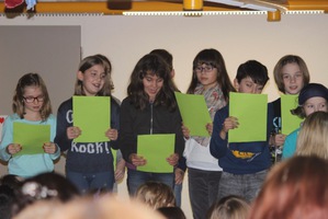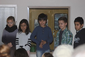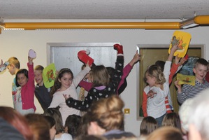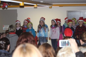 Frau Jany führte durch das abwechslungsreiche Programm, bei dem auch immer wieder das Thema „Lebkuchen“ aufgegriffen wurde. Die Klasse 3b sang das Lied von Leo, dem Lebkuchenmann ganz deutlich und gut verständlich vor, alle Schüler sangen das englische Lied „ the Ginger bread man“ ( der Lebkuchenmann), die Klasse 2b führte einen launigen Weihnachtstanz auf, die Klasse 3a trug das spannende Gedicht von der Weihnachtsmaus vor und plötzlich kamen lauter kleine Nikoläuse auf die Bühne! Es waren die Erstklässler mit dem fetzigen Bewegungslied „1,2,3 in einer Nuss“.