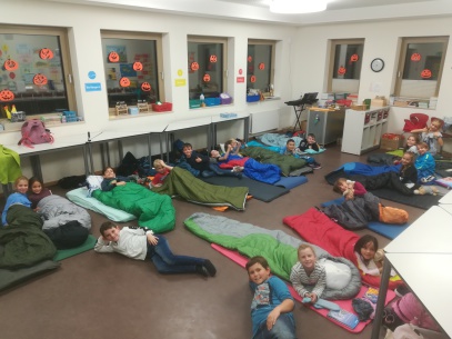 Am 25. Oktober 2019 fand unsere Übernachtung in der Schule statt. Abends kamen alle schwer bepackt im Klassenzimmer an. Zuerst hatten wir Zeit, unser Nachtlager einzurichten. Die Lehrerin sagte: „Nehmt eure Taschenlampe mit und stellt euch in einer Zweierreihe auf.“ Dann ging das Abenteuer los! Wir spielten mit unseren Taschenlampen auf dem Spielplatz. Die Lehrerinnen riefen ihre Klassen zusammen und sagten: „Wir machen eine Nachtwanderung.“ Wir gingen runter zum Sportplatz und dann durch den Wald. Dort lagen viele Äste und ein umgestürzter Baum, über den wir drübersteigen mussten. Wir gingen über die Brücke zur Schleuse und wieder zurück zur Schule. Dort angekommen ging die Party ab! Wir spielten Gesellschaftsspiele und aßen Knabberzeug. Alle zogen sich um und spielten und lachten. Danach durften wir im Schulhaus leise herumlaufen. Wir gingen in die Küche zu der Tür, die in die Kernzeit führt. Da sahen wir eine Gestalt. Wir rannten alle schnell ins Klassenzimmer zurück. Später am Abend gingen alle Kinder Zähneputzen und kuschelten sich dann in ihren Schlafsack. Am nächsten Morgen gab es noch ein Frühstücksbuffet mit vielen leckeren Sachen. Danach war das Abenteuer leider schon vorbei.